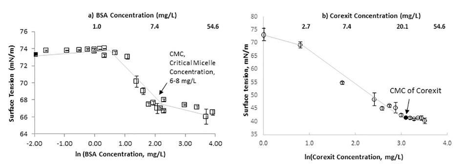 圖 4.a) 顯示了海水中模型蛋白質(zhì)的 SFT 作為其濃度自然對(duì)數(shù)的函數(shù)。 BSA 蛋白的 CMC 為 6–8 mg/L。 b) 顯示 Corexit 的 CMC 濃度為 22 mg/L。