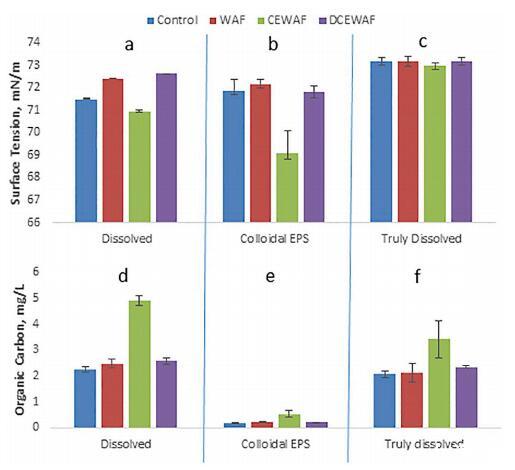 圖 2 中的有機(jī)碳表明大部分溶解的 部分,圖 2d,由低分子量碳組成,因?yàn)榭側(cè)芙獠糠郑瑘D 2f,幾乎等于 有機(jī)碳濃度中的溶解分?jǐn)?shù)。 膠體 餾分(圖 2e)表明超濾已去除了 85% 到 95% 的 溶解部分的有機(jī)碳。 這可能表明 5% 到 15% 的 CEWAF 可能保留在 EPS 膠體部分中, 表明 SFT 的降低(圖 2b)也受 Corexit 的影響 和 WAF。 然而,使用 SFT 與 Corexit 濃度數(shù)據(jù), 圖 4b,即使是 15% 的 Corexit 也無法解釋 在圖 1 的 CEWAF 處理中測(cè)量的 SFT 降低。