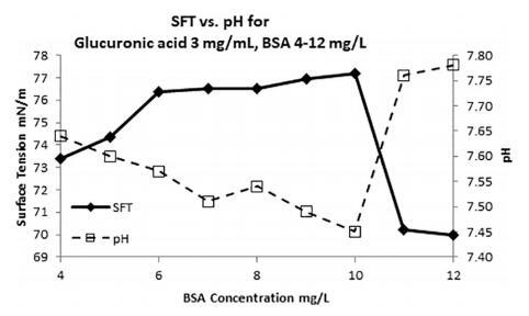 圖 6. 改變 BSA 蛋白的溶液中糖醛酸(葡萄糖醛酸)濃度為 3 mg/L 時(shí)的 SFT(菱形)和 pH(空心方塊) 濃度。 CMC,臨界膠束濃度,在 BSA 濃度為 10 mg/L + 3 mg/L 葡萄糖醛酸。 pH 值變化約 0.3 個(gè)單位 SFT 范圍為 7 mN/m。