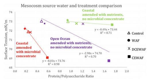 EPS 膠體溶液的 SFT 與 蛋白質(zhì)(更疏水)到多糖(更親水) 集中度,可以作為整體的相對(duì)度量 膠體部分的疏水性。 此外,圖1中的數(shù)據(jù) 意味著石油和/或 Corexit 的存在導(dǎo)致增強(qiáng) EPS 膠體的蛋白質(zhì):多糖比率,但降低了 膠體部分的 SFT。 CEWAF 中蛋白質(zhì)含量較高 處理對(duì)應(yīng)的細(xì)菌計(jì)數(shù)高于其他處理 治療(Kamalanathan 等人,2018 年;Doyle 等人,2018 年)。 DCEWAF 還具有更高的蛋白質(zhì)含量和更高的蛋白質(zhì):多糖 比 WAF 和對(duì)照處理。 值得注意的是,當(dāng) 與不同的中宇宙實(shí)驗(yàn)相比,開闊的海洋中宇宙的油濃度高兩倍,相對(duì) DCEWAF 處理中的 Corexit 含量較高,即它們僅 ~6.3 倍稀釋的 CEWAF,而 DCEWAF 處理來自 用微生物濃縮物修正的沿海水域約 15 倍 稀釋的 CEWAF 和經(jīng)過修正的營(yíng)養(yǎng)物質(zhì)的沿海水域是 ~ 10 倍稀釋的 DCEWAF(表 1)。 因此,趨勢(shì)線的斜率 可能受到 DCEWAF 中 Corexit 數(shù)量的影響,并且 CEWAF 處理 SFT 和蛋白質(zhì):多糖 比率。 由于其表面活性劑特性,Corexit 降低了 SFT,但它 還增強(qiáng)了蛋白質(zhì)的產(chǎn)生,導(dǎo)致比對(duì)照和 WAF 處理更高的蛋白質(zhì):多糖比率。 這 相對(duì) SFT 和蛋白質(zhì):對(duì)照和 WAF 的多糖位置 可能是由膠體和海水的組成和濃度的微小差異產(chǎn)生的。