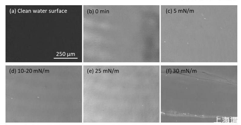 圖3、空氣-水界面處的FhuA膜BAM(布呂斯特角顯微鏡)圖。(a)在MPD緩沖液中擴(kuò)散FhuA WT之前和(b)之后的Langmuir槽氣-水界面BAM圖像;和(c-f)在不同表面壓力下的屏障壓縮。涂敷后立即在空氣-水界面上吸附一層致密均勻的FhuA WT膜。FhuA WT膜可以被壓縮到高達(dá)25 mN/m的表面壓力,而不會(huì)表現(xiàn)出不均勻性。在表面壓力為30 mN/m時(shí),在FhuA WT薄膜中可以看到垂直于壓縮方向的細(xì)長裂紋。