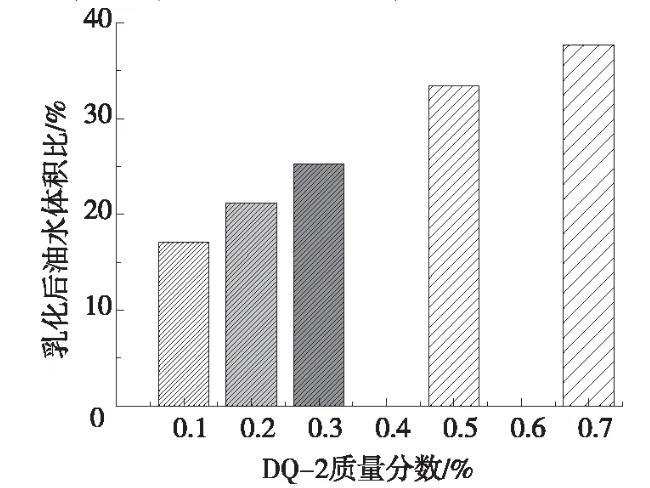 由圖4可知,不同濃度的DQ-2體系均具有一定的乳化作用,隨著體系濃度的增加,吸水量不斷降低,原油乳化作用不斷增強。當DQ-2體系的質量分數(shù)達到0.5%時,油水體積比為33.47%,后期繼續(xù)提高DQ-2體系的使用濃度,油水體積比趨于穩(wěn)定,通過實驗證實,DQ-2體系對于原油具有較好的乳化作用。