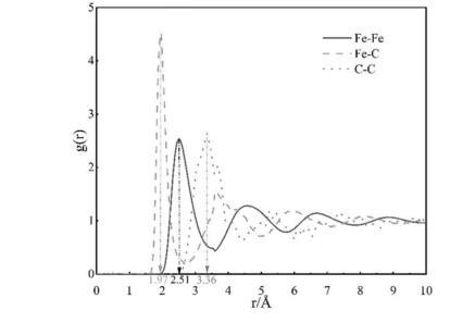 Fe-C二元體系經計算得到的徑向分布函數,F(xiàn)e-Fe、Fe-C、C-C原子對的平均鍵長分別為若原子間距離小于相應的鍵長值則表示兩個原子之間互相連接,根據碳原子連接的鐵原子個數,可將鐵原子區(qū)分為自由態(tài)鐵原子(與碳原子沒有配位關系)、A型鐵(只與1個碳原子形成配位關系)、B型鐵(與2個或更多的碳原子形成配位關系)三種類別,根據模擬結果數據可對鐵原子的配位方式進行分析。