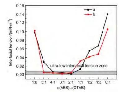 AES/烷基季銨鹽CTAB摩爾比為1:1的混合體系的β參數(shù)計算結(jié)果為~20.4,表明AES與烷基季銨鹽CTAB親水基間具有極強的吸引作用。值得注意的是,該體系還具有很高的溫度穩(wěn)定性,在55°C時仍能保持30 mN·m-1以下的表面張力。這說明在較高溫度時該體系的分子排列仍然較為緊密,這和陰陽離子表面活性劑體系中分子因靜電吸引造成的緊密排列是密切相關(guān)的。考慮到油水界面張力同樣與界面上的分子排列有關(guān),因此有可能在溫度較高時實現(xiàn)超低界面張力。