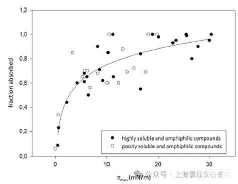 本論文研究人員提出了一種藥物活性分子生物利用度(fa)快速篩選方法-表面活性譜(SAP),作為替代傳統(tǒng)的動物研究和細胞培養(yǎng)篩選。研究人員使用SAP技術,主要是基于Kibron公司的高通量表面張力分析儀----(Delta-8),該儀器只需要50ul原液就能進行完整的滲透率分析。并將溶液中化合物的表面活性譜化合物與生物膜相互作用或穿透生物膜的潛力聯(lián)系起來。用于這種關聯(lián)的進一步參數(shù)包括臨界膠束濃度(CMC)、界面空氣/水分配系數(shù)(KAW?1)和分子在界面的面積要求,即截面面積(AS)等這些表面活性參數(shù)來獲取藥物的生物利用度(fa值)。此方法的提出對于先導化合物的早期篩選研究,因為先導化合物只有少量的化合物可用,SAP方法似乎是一個很有效和快速的工具,可以準確預測兩親性化合物的fa值,為新藥研發(fā)提供了重要的技術支持,這也說明高通量的表面張力分析儀(delta-8)在藥物研發(fā)方面發(fā)揮了重要的作用,尤其是預測活性藥物分子的生物利用度(fa)提供了一種新的技術手段。