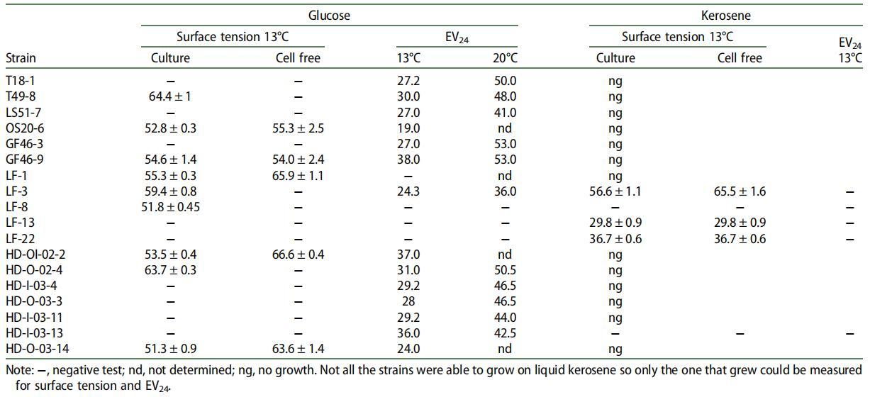 表 1. 在葡萄糖和煤油上生長的細菌菌株的培養(yǎng)物和培養(yǎng)物濾液的表面張力和乳化值。
