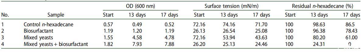 表 4. 正十六烷生物降解試驗中的細菌生長、表面張力和正十六烷殘留量(結(jié)果為兩次重復(fù)的平均值)。