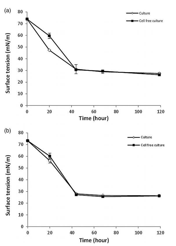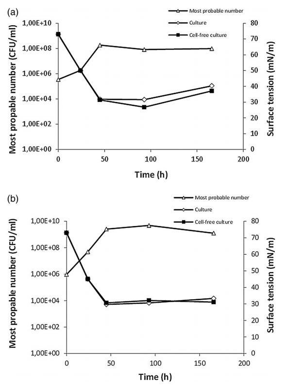 菌株紅球菌屬。 菌株 LF-13 和紅球菌屬。 大約 2 天后,菌株 LF-22 達到穩(wěn)定期(圖 1)。 LF-13 和 LF-22 的培養(yǎng)物表面張力的最低值分別為 31.8 和 29.3 mN m-1,當(dāng)培養(yǎng)物達到穩(wěn)定期時(圖 1)。 無細胞制劑的值顯示出與培養(yǎng)物類似的降低,表明生物表面活性劑被釋放到培養(yǎng)基中。 從工業(yè)角度來看,將生物表面活性劑分泌到培養(yǎng)基中的分離物很有趣,因為這使得生物表面活性劑的純化過程更簡單。 [16,44,45]
