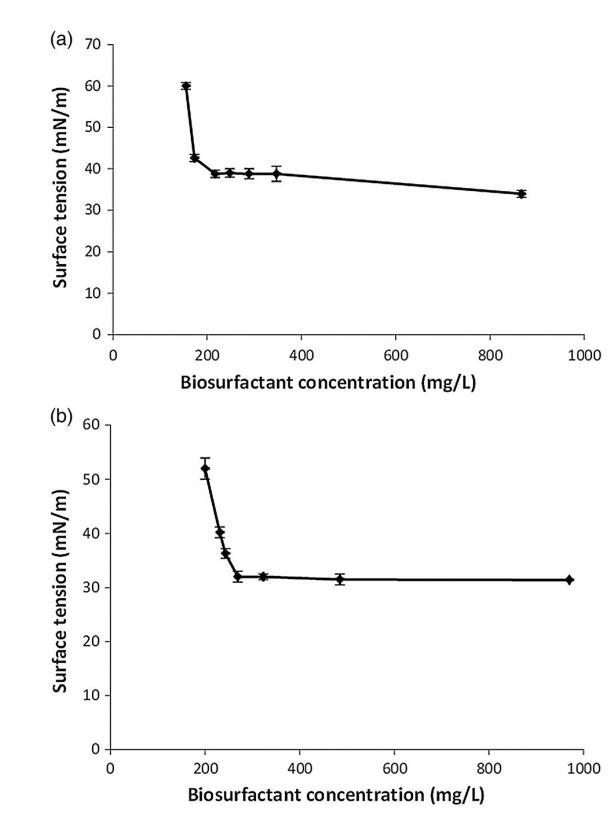 如材料和方法部分所述,使用 MTBE 從兩種紅球菌屬菌株的靜息細胞培養(yǎng)物中提取生物表面活性劑。 提取的生物表面活性劑用于測定CMC濃度。 來自菌株 LF-13 的生物表面活性劑的 CMC 約為 217 mg/L,菌株 LF-22 的 CMC 約為 269 mg/L(圖 3)。