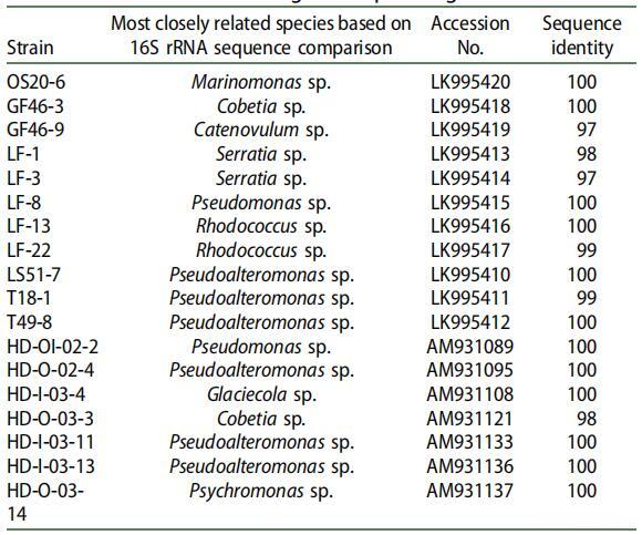 通過 16S rRNA 基因序列分析對具有顯著 SAC 活性的 18 個分離株進行分類鑒定(表 2)。 紅球菌除外。 菌株 LF-13 和紅球菌屬。 在菌株 LF-22 中,大多數(shù)鑒定的 SAC 生產(chǎn)者是革蘭氏陰性菌,屬于 γ-變形菌綱。 也有報道稱 γ-變形菌在寒冷海洋地區(qū)的石油污染地點占優(yōu)勢。 [21-24] 先前對石油污染地點的研究表明,假單胞菌、假交替單胞菌、冰川、海藻和紅球菌是極地、海洋區(qū)域。[21,22,25-28]