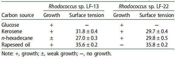 兩種細菌菌株紅球菌屬。 菌株 LF-13 和紅球菌屬。 當(dāng)以煤油作為唯一碳源和能源時,菌株 LF-22 能夠?qū)⑴囵B(yǎng)基的表面張力降低約 40 mN m-1。 因此,它們被選擇用于進一步表征生物表面活性劑的生產(chǎn)。 為了拓寬生物表面活性劑生產(chǎn)的底物范圍,測試了除煤油和葡萄糖之外的其他碳源(表 3)。 這兩種菌株可以在葡萄糖上生長,但不合成生物表面活性劑。 他們能夠在正十六烷和菜籽油上產(chǎn)生 SAC,即使菜籽油不支持菌株 LF-22 的生長。