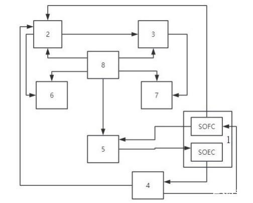 所述供電模塊1包括SOFC-SOEC電池1-1、工業用電單元1-2、逆變器1-3、高頻感應電源1-4,所述工業用電單元1-2分別與所述SOFC-SOEC電池1-1中的SOEC電解池、所述等離子噴射模塊2連接,所述儲氫模塊4分別與所述SOEC電解池、SOFC燃料電池、等離子噴射模塊2連接,將SOEC電解池電解氫收集存儲的氫氣用于SOFC燃料電池使用、為等離子噴射模塊2中等離子噴射器供應電離氣體(氫氣);所述SOFC燃料電池、SOEC電解池均與所述蓄熱模塊5連接。