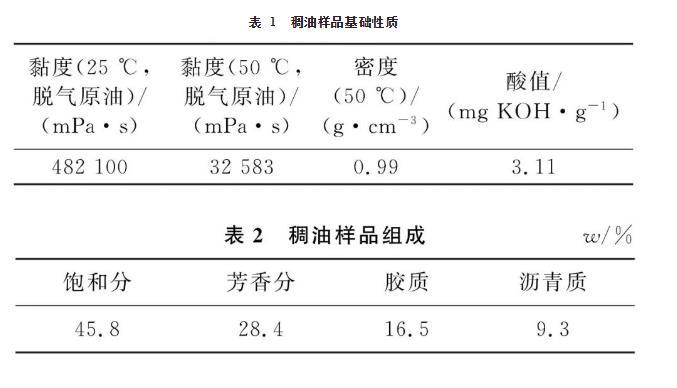 實驗所用材料:凍膠分散體,實驗室自制[18];稠油冷采降黏劑,上海諾頌實業有限公司;實驗用模擬地層水礦化度8 000 mg/L(NaCl與CaCl2質量比為9∶1);所用稠油樣品為勝利油田河口采油廠的特超稠油,油藏溫度為50℃,樣品基礎性質及組成見表1和表2。