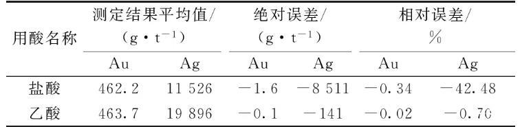 實驗樣品金含量463.8 g/t,銀含量20 037 g/t,進行除鉍用酸量的實驗,試驗用酸為乙酸(1+1),結(jié)果見表5,從結(jié)果可以看出50、100 mL乙酸用量,大部分固體物質(zhì)沒被溶解,大部分鉍沒被除去,乙酸用量200 mL時,固體物質(zhì)基本被溶解,結(jié)果較準確,可以滿足測定要求。在結(jié)果準確的情況下選擇用量少的,所以實驗選擇乙酸用量為200 mL。