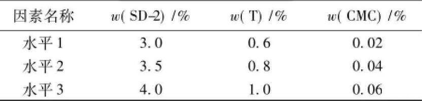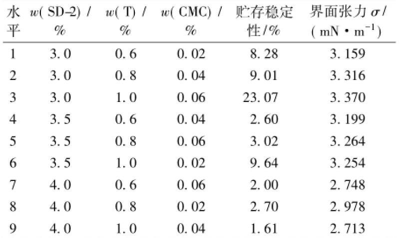 乳化劑SD-2,締合型增稠劑T和羧甲基纖維鈉等是CA砂漿陰離子乳化瀝青中最關(guān)鍵的3種組分,對乳化瀝青的性能起著決定性的影響。為了比較對油水界面張力和乳化瀝青貯存穩(wěn)定性的影響,采用L9(34)正交試驗(yàn)的方法進(jìn)行優(yōu)化設(shè)計,因素水平見表1。