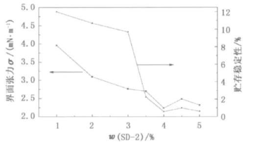 從分子結(jié)構(gòu)上來看,羧甲基纖維鈉也屬于表面活性劑的范疇,具有一定的乳化能力。因此,羧甲基纖維素鈉與乳化劑SD-2具有較好的協(xié)同效應(yīng),在較低的質(zhì)量分?jǐn)?shù)時就能夠顯著降低界面張力值,改善乳液的貯存穩(wěn)定性。