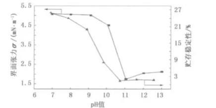圖2皂液pH值對界面張力和貯存穩(wěn)定性界面張力的影響
