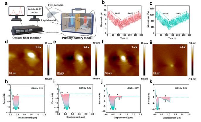 圖2電極材料的應(yīng)力-電化學(xué)測(cè)試。(a)光纖布拉格光柵傳感器(FBG)在液態(tài)金屬中的應(yīng)力-電化學(xué)測(cè)試示意圖。(b,c)FBG在液態(tài)金屬中的應(yīng)力響應(yīng)圖。(d-g)不同電壓下軟包電池中LMNCs的AFM測(cè)試圖。(h-k)不同電壓下的LMNCs力-位移曲線圖。