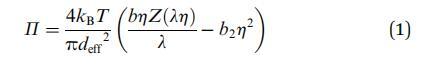 吸附在流體-流體界面上的粒子與 并產生表面壓力 (P),即 3D 系統中壓力的 2D 模擬。 通過擴展這個 進一步類比,也可以將這個表面壓力聯系起來 通過狀態方程到其他狀態參數,如數密度和溫度。 用于吸附膠體顆粒 在流體-流體界面上,最簡單的近似可能是 2D硬盤。 狀態方程 (EOS) 為一個 組件系統根據密度相關性給出 壓縮系數 Z。文獻中充滿了 提供表達的多種方法 EOS 2D 硬盤液。 Mulero 等人 27,28 提供了一個簡潔的 回顧和比較所有這些狀態方程。