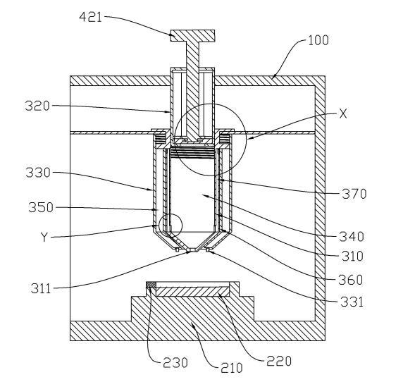 副筒320和滴液筒310之間限定出滴液腔340,滴液筒310上開(kāi)設(shè)有出液口311,滴液腔340與出液口311連通。涂片臺(tái)200安裝于外殼100上,出液口311和涂片臺(tái)200在第一方向上依次設(shè)置,且當(dāng)出液口311滴出一個(gè)待檢測(cè)液的液滴時(shí),液滴沿第一方向上靠近涂片臺(tái)200的一端能夠與涂片臺(tái)200接觸。外筒330上具有第一空腔350,外筒330上開(kāi)設(shè)有進(jìn)氣口331,進(jìn)氣口331設(shè)置在出液口311外側(cè),進(jìn)氣口331與第一空腔350連通。滴液筒310繞第一方向轉(zhuǎn)動(dòng)能夠分別促使副筒320和外筒330沿第一方向移動(dòng),且在進(jìn)行滴液操作時(shí),副筒320沿第一方向移動(dòng)能夠使滴液腔340體積變小,外筒330沿第一方向移動(dòng)能夠使第一空腔350體積變大。