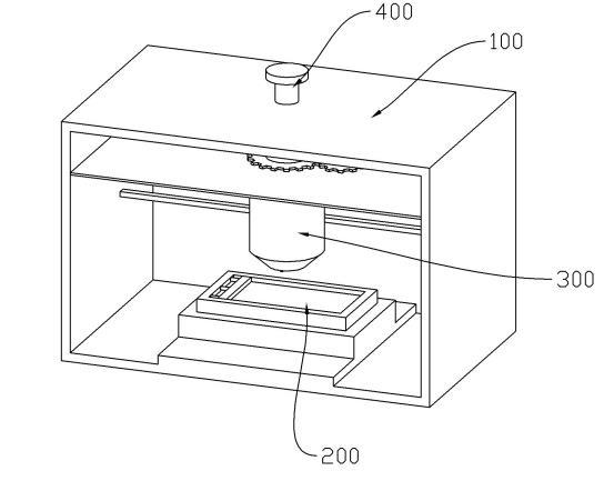 圖中:100、外殼;101、第一隔板;102、第二隔板;110、第一電機(jī);200、涂片臺(tái);210、臺(tái)體;220、承載板;230、推板;300、滴液機(jī)構(gòu);310、滴液筒;311、出液口;312、第二氣口;320、副筒;330、外筒;331、進(jìn)氣口;340、滴液腔;350、第一空腔;360、混合筒;361、第一氣口;370、第二空腔;400、排氣機(jī)構(gòu);410、排氣板;411、排氣口;420、轉(zhuǎn)動(dòng)板;421、把手。