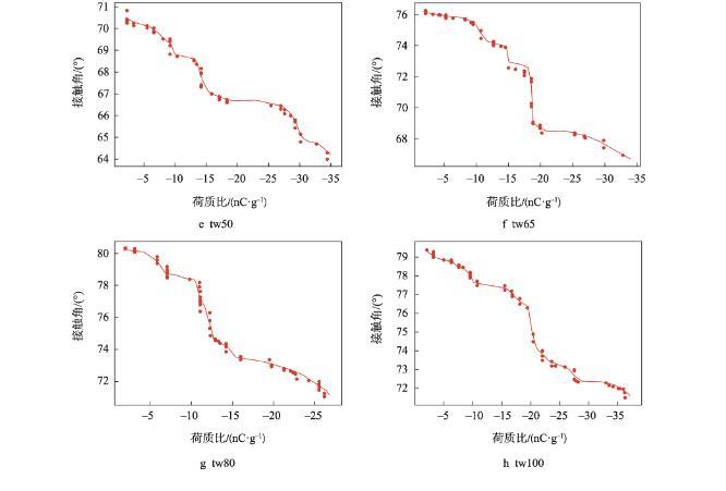 荷電使得液滴的接觸角顯著降低(<0.05),其中7 kV的電壓能夠使去離子水液滴的接觸角降低約10°,明膠液滴接觸角下降約6°~9°。茹煜等[19]建立了荷電霧滴的三維運動模型,發現在20 kV的電壓下熒光液滴的接觸角能夠降低46°。本研究發現,當表面活性劑吐溫20與司盤20的濃度比為1∶1(tw50),外加電壓為7 kV時,明膠液滴在石蠟表面具有最好的潤濕性,接觸角為64.99°。