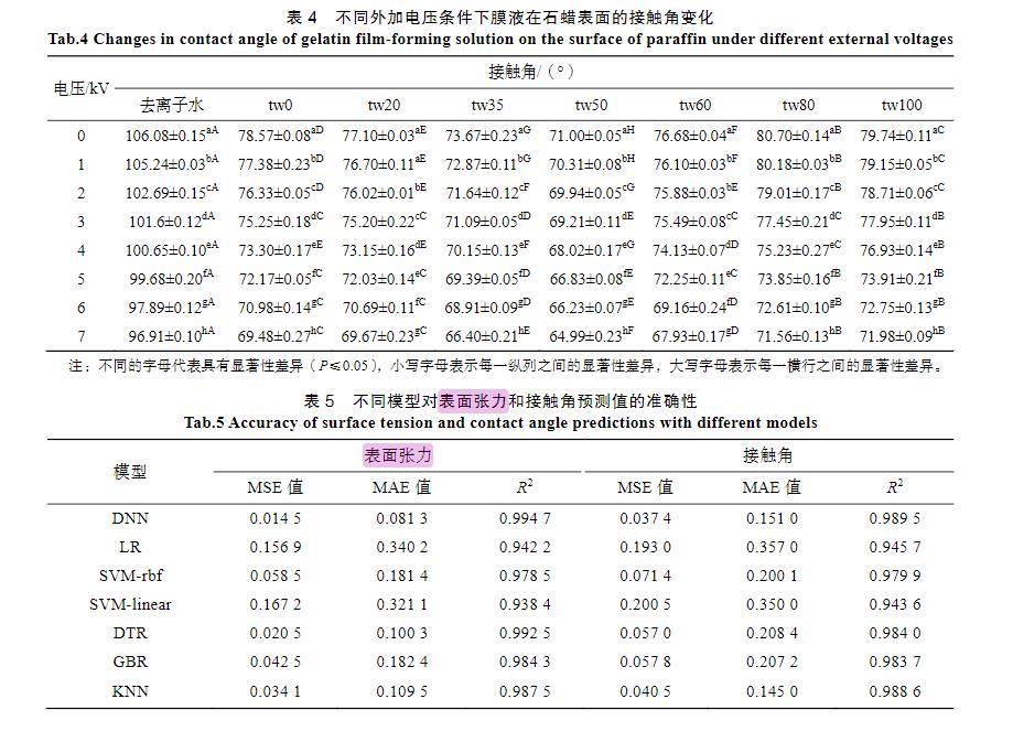 本文探究了在不同電源電壓下通過感應荷電的方式對明膠液滴荷質比、表面張力及接觸角的影響,并通過深度神經網絡建立模型預測。結果發現,靜電荷電能有效提高明膠液滴的潤濕性能,當外加電壓為7 kV時,明膠成膜液滴的表面張力可以下降9%~14%,接觸角能夠下降8%~12%。從而為形成更均勻、更完整的可食性涂膜提供新的手段。在明膠的質量分數為3%、表面活性劑的質量分數為0.05%、吐溫20與司盤20濃度比為1∶1、電壓為0~7 kV時,深度神經網絡模型對膜液荷質比與表面張力或接觸角的關系具有良好的預測作用,可用于指導實踐操作。