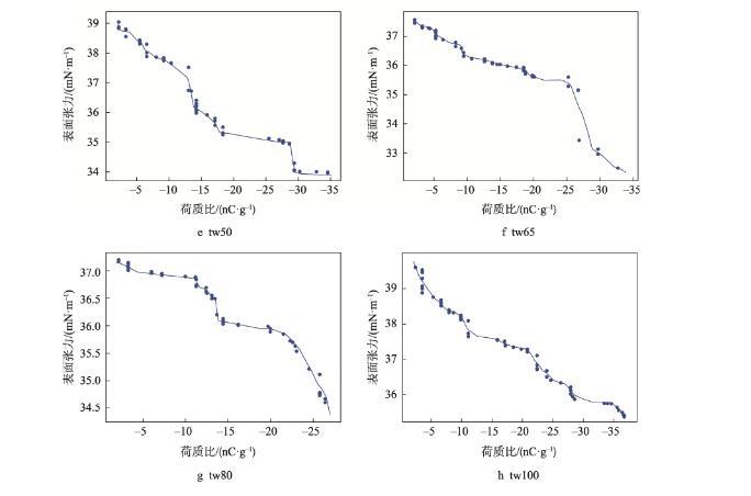 隨著膜液中吐溫20的減少和司盤20的增多,明膠液滴荷質比亦呈增高趨勢(<0.05)。張建桃等[13]研究表明,介質的電導率改變會引起其荷電性能的改變。相同質量濃度下司盤20的物質的量濃度更高,導致溶液電導率及液滴荷質比增加更為明顯。然而,與只添加吐溫20的明膠溶液(tw100)相比,少量司盤20的添加(tw80)還會引起荷質比的顯著減少(<0.05),推測這是由于溶液中吐溫20與司盤20分子通過“經典疏水作用”在水溶液中優先結合,從而使溶液中總溶質相對濃度下降導致[14]。