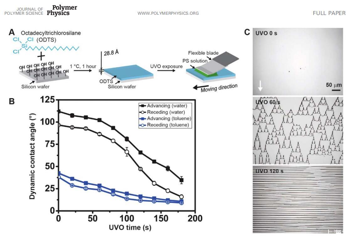 拋光硅片(直徑 100 mm,厚度 500 lm, 100 方向,P/B 摻雜,大學晶圓)襯底 (通常切成 1.2 3 1.2 厘米)通過沖洗制備 用甲苯、丙酮和去離子水,在下干燥 氮,然后用 Harrick 氧等離子體處理 250 mTorr 持續 20 分鐘。 氧化層厚度用橢偏儀測量(折射率,n1 5 1.46-設置,LSE Stokes 橢偏儀,Gaertner, Inc.)。 將表面改性的基材轉移到密封的 20 mL 閃爍瓶中,該瓶中裝有 1 L 正十八烷基三氯硅烷 (ODTS)(95%,Gelest, Inc.)和 999 lL 甲苯(使用來自 Fisher Scientific) (按體積計 0.1% ODTS)。 每個小瓶都放入冰水中 浴 1 小時,將溫度調節至 1 8C。 1 小時后, 按照相同的預處理過程沖洗和干燥每個小瓶中的改性硅晶片,但不包括 20 分鐘 氧等離子體處理。 然后將晶片在 120 8C烘箱2小時,冷卻至室溫,在甲苯中超聲60秒。 晶片再次沖洗并 干了。 ODTS 層的厚度測量 橢偏儀(ODTS,折射率,n2 5 1.457,Gelest, Inc.)作為 28.8 6 0.83 ?(20 個樣品的平均值)[圖。 1(A)]。 控制 表面能,改性ODTS層用 不同曝光時間的 UVO(Jelight 342 UVO 系統)。 緊接著,基板被用于測量 動態接觸角或流涂。