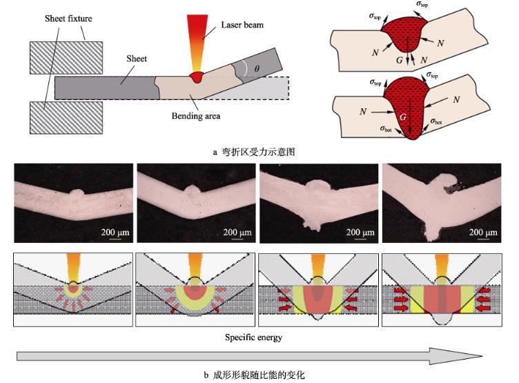 通過(guò)觀察激光熱應(yīng)力成形過(guò)程中彎折處的形貌發(fā)現(xiàn),激光熱輸入、彎曲角度和成形機(jī)制會(huì)影響彎折區(qū)材料表面的擠壓、熔化、流動(dòng)和凝固過(guò)程,以及材料內(nèi)部的溫度梯度和界面表面張力,這些影響導(dǎo)致彎折區(qū)域的輪廓形貌、粗糙度、顯微組織、硬度分布發(fā)生變化。在激光熱應(yīng)力成形過(guò)程中,熔池的受力情況如圖1a所示。一方面,當(dāng)比能較小且熔凝區(qū)僅存在金屬板上表面時(shí),薄板彎折處的增厚主要受到左右兩側(cè)和下側(cè)冷端材料的約束作用,通過(guò)作用于上側(cè)材料,且上表面局部熔化的材料在頂端表面張力的作用下,形成了頂部凸起的形貌。同時(shí),由于激光瞬態(tài)作用時(shí)間較短,熔融材料在激光掃描結(jié)束后快速凝固,并在掃描次數(shù)逐漸增加的過(guò)程中形成連續(xù)隆起的形貌,在彎折處形貌演變過(guò)程中粗糙度逐漸增大。在高比能下,薄板彎折處材料的熔化凝固和塑性變形受到左右兩側(cè)材料的橫向約束,該區(qū)域在左右兩側(cè)材料的擠壓下增厚。