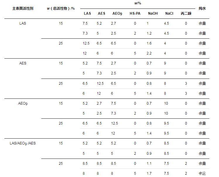 由前文可知,不同表面活性劑在膠束形態(tài)、增稠、去污等多個(gè)方面均有不同表現(xiàn)。對(duì)于結(jié)構(gòu)型洗滌劑,考察不同主表面活性劑的區(qū)別,同時(shí)探究了HS-PA在形成結(jié)構(gòu)型洗滌劑中發(fā)揮的作用。與增稠性能類(lèi)似,不同配方體系形成結(jié)構(gòu)型洗滌劑所需添加的鹽量也不同。因此,在設(shè)計(jì)配方時(shí),只要求同組的實(shí)驗(yàn)樣品(含HS-PA)和空白樣品(不含HS-PA)的鹽量相同(制備樣品時(shí),以鹽量加至空白組出現(xiàn)剪切變稀的現(xiàn)象為準(zhǔn)),具體配方如表2所示(表中LAS、AES已換算為純質(zhì)量分?jǐn)?shù),HS-PA(w=30%)未換算)。
