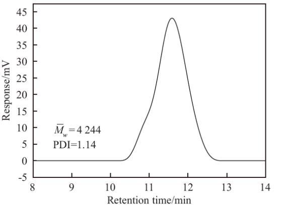 圖1為HS-PA的相對(duì)分子量以及分散性指數(shù)PDI。由圖1可知,聚醚-聚丙烯酸/酯高分子表面活性劑的GPC圖呈單峰分布,重均分子量為4 244,PDI為1.14,表明其為均一的聚合物,且分子量分布較為均勻。
