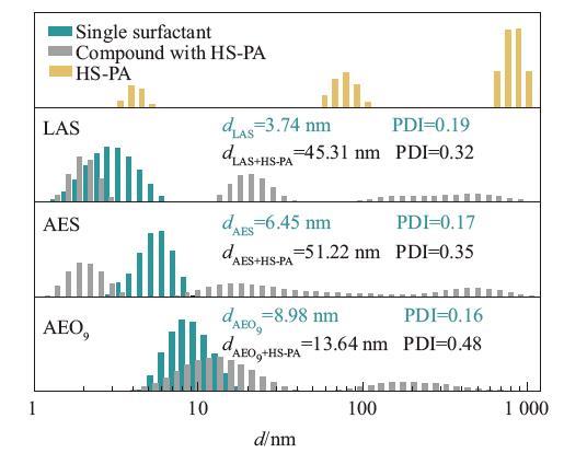 為了探究高分子表面活性劑在水溶液中聚集行為,考察了常規(guī)表面活性劑與HS-PA復(fù)配前后的膠束粒徑變化。由圖3的結(jié)果可知,3種低分子量表面活性劑的聚集體尺寸及分布情況比較相似,其粒徑均小于10 nm,呈現(xiàn)出單峰分布。LAS、AES和AEO9的平均膠束粒徑分別為3.74,6.45和8.98 nm。PDI越大,說(shuō)明其粒徑分布越寬,高分子表面活性劑HS-PA的PDI大于0.5,其粒徑情況不適合用平均粒徑值表示,因此未在圖中提供平均粒徑的數(shù)據(jù)。從圖3中HS-PA的粒徑分布情況可以看出,其聚集體為多峰分布,且分布較寬。粒徑為3~5 nm的聚集體可能是HS-PA的單分子膠束。與低分子量表面活性劑不同,在稀溶液中,高分子表面活性劑結(jié)構(gòu)中的疏水鏈段傾向于聚集,分子卷縮,可自身形成單分子膠束,該現(xiàn)象曾被許多研究報(bào)道。粒徑為50~110 nm以及650~1 000 nm的為HS-PA的有序多分子聚集體,如膠束、小囊泡等。HS-PA分子量大,分子中的疏水鏈段和親水鏈段長(zhǎng),導(dǎo)致其有序多分子聚集體的粒徑明顯比低分子量表面活性劑大。