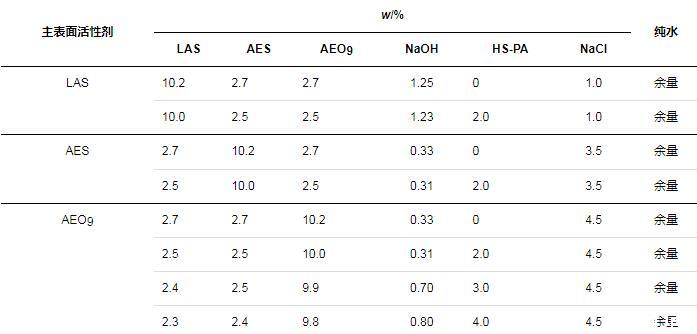 分別考察了在以L(fǎng)AS、AES和AEO9為主要表面活性劑的體系中,HS-PA作為改性聚丙烯酸/酯高分子表面活性劑可發(fā)揮的增稠以及去污效果。在配方設(shè)計(jì)上,總活性物質(zhì)量分?jǐn)?shù)約為15%。由于HS-PA的增稠作用需要和NaCl協(xié)同起效,而不同配方的耐鹽性不同,因此,根據(jù)空白組(無(wú)HS-PA)配方黏度不反稀的NaCl用量,來(lái)確定同組樣品(含HS-PA)的NaCl用量,具體配方如表1所示(表中LAS、AES已換算為純質(zhì)量分?jǐn)?shù),HS-PA(w=30%)未換算)。