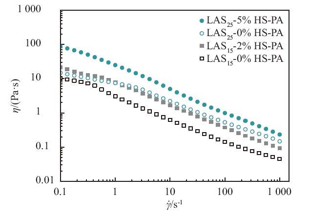 圖7為不同配方洗滌劑的表觀黏度隨剪切速率變化曲線(xiàn),隨著剪切速率不斷增加,4個(gè)樣品的表觀黏度均逐漸減小,表現(xiàn)出剪切變稀的非牛頓流體行為。在恒定剪切速率下,體系中加入HS-PA將提高洗滌劑的黏度。結(jié)合偏光顯微鏡圖像可知,HS-PA的加入使得分子空間堆積構(gòu)型發(fā)生改變,體系中出現(xiàn)更多的球形層狀液晶,液晶結(jié)構(gòu)越多越完整,則說(shuō)明其形成的聚集體中,分子排布越緊密且越有序,層間發(fā)生滑動(dòng)時(shí)越困難,宏觀表現(xiàn)為黏度越大。當(dāng)無(wú)HS-PA影響時(shí),在相同剪切速率下,活性物質(zhì)量分?jǐn)?shù)越高,黏度越大。這可能是因?yàn)榛钚晕镔|(zhì)量分?jǐn)?shù)越大,表面活性劑分子之間作用力越強(qiáng),分子鏈發(fā)生相對(duì)運(yùn)動(dòng)時(shí)的阻礙效果越明顯,黏度則越大。