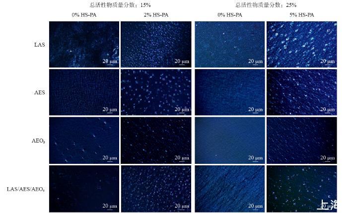 圖5為結(jié)構(gòu)型洗滌劑的偏光紋理圖(表2中的配方,以“主表面活性劑—總活性物質(zhì)量分?jǐn)?shù)—HS-PA質(zhì)量分?jǐn)?shù)”區(qū)分)。從圖中可以明顯看出,在分別以L(fǎng)AS、AES和AEO9為主表面活性劑的配方中,當(dāng)總活性物質(zhì)量分?jǐn)?shù)約為15%或者25%時(shí),加入HS-PA后,偏光圖像中的馬耳他十字液晶形狀均明顯增多。馬耳他十字是球形層狀液晶的典型織構(gòu),說(shuō)明了HS-PA的加入有利于體系形成球形層狀液晶。當(dāng)體系中不含HS-PA時(shí),偏光視野并非完全暗場(chǎng),而是有微弱的油狀條紋或者少量的馬耳他十字,表明其中也具有部分平面或者球形層狀液晶結(jié)構(gòu),但液晶較弱。不同主表面活性劑的層狀液晶結(jié)構(gòu)存在一些區(qū)別,AEO9為主表面活性劑的配方,其十字花紋理直徑為2~3μm,小于LAS、AES以及三元表面活性劑平衡體系的十字花紋理直徑(7~10μm)。以上結(jié)果與HS-PA復(fù)配體系中的粒徑分布變化相吻合:當(dāng)HS-PA與低分子量表面活性劑復(fù)配時(shí),LAS/AES與HS-PA的混合膠束粒徑明顯變大,但AEO9與HS-PA的混合膠束粒徑只略微變大。根據(jù)球形層狀液晶的結(jié)構(gòu)可知,其內(nèi)部混合膠束粒徑越大,則相應(yīng)的液晶粒徑越大。對(duì)于除AEO9外的其他3種體系而言,總活性物質(zhì)量分?jǐn)?shù)從15%提高到25%,HS-PA加量從2%增加至5%,球形層狀液晶的粒徑會(huì)相應(yīng)增大,此現(xiàn)象在LAS為主表面活性劑以及LAS較多的三元表面活性劑平衡體系中更為明顯。