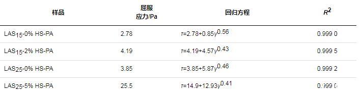 根據(jù)Herschel-Bulkley模型擬合的回歸方程及流變參數(shù)如表5所示(命名規(guī)則:主表面活性劑總活性物質(zhì)量分?jǐn)?shù)-HS-PA用量),其中擬合曲線(xiàn)相關(guān)系數(shù)(R2)均不小于0.999,相關(guān)性較高,表明LAS體系的流變性可以利用Herschel-Bulkley模型進(jìn)行研究。在活性物質(zhì)量分?jǐn)?shù)為15%的體系中添加2%HS-PA,屈服應(yīng)力從原先的2.78 Pa提高至4.19 Pa,在25%活性物配方中加入5%HS-PA,屈服應(yīng)力由3.85 Pa提高至25.5 Pa,說(shuō)明HS-PA的添加可以提高體系的屈服應(yīng)力。屈服應(yīng)力是指液晶結(jié)構(gòu)破壞時(shí)的臨界剪切應(yīng)力值。由前文研究結(jié)果可知,HS-PA的加入使配方獲得更多更致密的球形層狀液晶,因此,相應(yīng)地,體系屈服應(yīng)力也越大。而屈服應(yīng)力越大,當(dāng)體系中包含水不溶粒子(如微膠囊)時(shí)越容易穩(wěn)定,該結(jié)果與離心測(cè)試結(jié)果相契合。