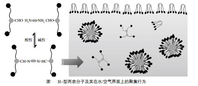 另外一類是含有活性可斷裂鍵的表面活性劑,其中亞胺鍵是一類比較典型的動態(tài)共價鍵。許多新穎的基于亞胺鍵構(gòu)筑的H-型兩親分子,其中亞胺鍵用于連接兩個Bola型的兩親分子,H-型兩親分子自組裝可形成膠束,當pH從堿性調(diào)至弱酸性時,亞胺鍵發(fā)生水解,從而導(dǎo)致兩親分子的解離以及不同聚集體形態(tài)之間的轉(zhuǎn)變。