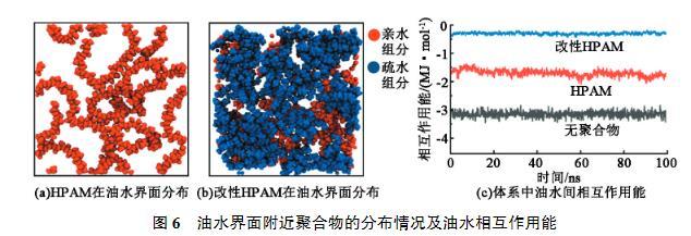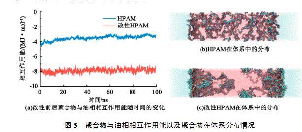 界面張力來(lái)自于界面處分子受到的應(yīng)力不均衡,因此需要增加兩相之間的聯(lián)系,從而減少界面張力。由于HPAM分子本身親水,與水相具有較強(qiáng)的相互作用,因此主要考察HPAM和油相之間的相互作用強(qiáng)度。圖5(a)為HPAM和改性HPAM與油相的相互作用能隨時(shí)間的變化。可以看出,HPAM在0~100 ns的模擬過(guò)程中相互作用強(qiáng)度逐漸降低,說(shuō)明部分HPAM從油水界面處脫離進(jìn)入水相。由圖5(b)也看出HPAM分子大量均勻分布在水相中,其主要原因也是缺少親油基團(tuán),不易在界面處穩(wěn)定存在,更傾向于溶解于水中。而引入疏水基團(tuán)改性后的HPAM與油相的相互作用能明顯強(qiáng)于HPAM與油相的作用能。由圖5(c)看出改性HPAM大多數(shù)分布在油水界面附近。改性HPAM在界面處橋接了油相與水相,緩解了界面處分子應(yīng)力不均衡,從而起到降低界面張力的效果。
