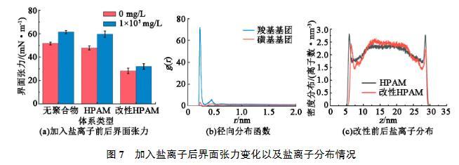 部分儲(chǔ)層中存在較高的礦化度,為此進(jìn)一步研究鹽離子對(duì)界面張力的影響。在3個(gè)體系的水相中分別加入質(zhì)量濃度為100 g/L的NaCl,觀察其對(duì)界面張力的影響情況,結(jié)果見(jiàn)圖7(a)。可以看出,對(duì)于沒(méi)有聚合物存在的體系中,界面張力會(huì)隨著鹽離子的增加而增大。這是由于鹽離子的存在增大了水相的極性,從而拉大了油水兩相性質(zhì)上的差距,增大了油水界面張力。因此當(dāng)界面處的鹽離子增多時(shí),界面張力則會(huì)增大。加入HPAM的體系中也出現(xiàn)了類(lèi)似的情況。然而引入磺酸基團(tuán)改性后的HPAM則受鹽離子的影響較小。為了解釋這一現(xiàn)象的物理機(jī)制,分析了帶電基團(tuán)周?chē)鶱a+分布(圖7(b))。通過(guò)計(jì)算徑向分布函數(shù)g(r),發(fā)現(xiàn)羧酸基團(tuán)周?chē)溯^多的Na+,導(dǎo)致Na+在聚合物附近聚集,而改性引入的磺酸基團(tuán)具有一定的抗鹽作用,其周?chē)植嫉腘a+數(shù)量更少。這也就導(dǎo)致2種體系界面附近Na+密度不同(圖7(c))。由于HPAM含有較多的羧酸基團(tuán),會(huì)引起Na+在聚合物附近的富集,導(dǎo)致界面張力的增加。而在加入改性HPAM后,引入的磺酸基團(tuán)對(duì)Na+的吸引力較弱,導(dǎo)致界面附近的Na+和改性前相比有明顯的減少,界面張力增加較少。因此加入磺化改性的HPAM在高礦化度下仍然可以保持較高的界面活性。