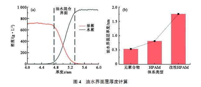 界面層厚度能夠反映油水界面處兩相的混合情況,一般來(lái)說(shuō)界面厚度越大說(shuō)明兩相之間的排斥越小,互溶效果越好,界面張力越低。參考Ricardo Paredes等的方法,選取密度低于油和水密度峰值90%的區(qū)域作為油水混合界面,如圖4(a)所示。計(jì)算得到的界面層厚度見(jiàn)圖4(b)。可以發(fā)現(xiàn),加入HPAM對(duì)于界面層影響很小,改性HPAM的加入可以大幅提高油水界面層厚度。這也反映出未改性HPAM油水界面依然比較清晰,兩相界限明顯,界面處油分子和水分子受力不均勻的現(xiàn)象依然嚴(yán)重;改性HPAM疏水基團(tuán)進(jìn)入油相中,引起z方向油水分布重疊區(qū)域變大,油水界面區(qū)域擴(kuò)展,油水界面變得凹凸不平,油水相的“螯合”加強(qiáng),界面處分子受力不均衡得到了緩解,有利于界面張力降低。