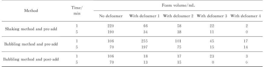 (3)消泡性能測試方法中,搖瓶法偏重研究消泡劑的消泡性能,鼓氣法偏重于研究消泡劑的抑泡性能。添加方式中后添加比先添加表現出更好的消抑泡性能。