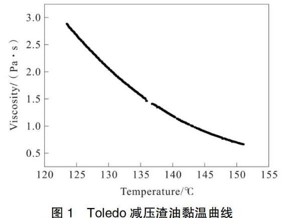 考慮到上述因素,本文在根據(jù)現(xiàn)有儀器測得的相對較低溫度條件下的黏溫曲線關(guān)系的基礎(chǔ)上進行了減壓渣油較高溫度條件下黏溫關(guān)系的計算近似,以求對減壓渣油反應(yīng)模型進行較為準確的理論模型建立的指導。就目前的技術(shù)而言,在缺少直接測量儀器以及相關(guān)行業(yè)標準的情況下,利用模型進行計算模擬近似,是最具說服性地技術(shù)手段。圖1為實驗室中實際測得的在相對較低溫度下Toledo減渣的黏溫曲線。