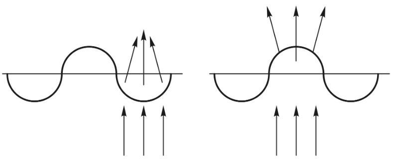由于水波傳播速度較快,難以直接觀測水波的傳播情況和波峰位置。實驗中通過錄制視頻的方式來觀測水波傳播的過程。首先將透明水槽放置在固定高度的底座上,在水槽下方放置光源。水波波動時表面的起伏會像凸透鏡、凹透鏡一樣將光線會聚或發散(圖3),此時在水面上方放置整潔的紙張作為屏幕承接光線,便可以看到明暗相間的區域,分別對應水波的波谷和波峰。同時,若將透明的刻度尺放入水中,則可以將刻度尺一同投影到屏幕上,從而測量出水波的位置數據。然后,將攝像設備(手機及手機支架)放置在屏幕上方拍攝屏幕上水波的光投影(圖4),記錄水波傳播的過程。最后,使用電腦單幀播放錄制的視頻,從而放慢水波傳播的過程以便于準確測量波峰位置。此外,由于水滴滴落時形成的是形如同心圓的一組水波,便可以在單幀畫面中測量多個相鄰波峰的位置得到波長。