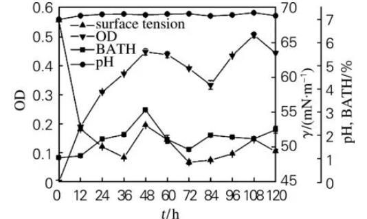 生物表面活性劑產(chǎn)生菌菌體密度、細胞疏水性與發(fā)酵液pH及表面張力的關系(二)