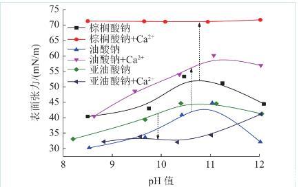 應(yīng)用鉑片法對(duì)溶液表面張力進(jìn)行測(cè)試,測(cè)試前使用乙醇和去離子水對(duì)測(cè)試玻璃皿進(jìn)行清洗,直至測(cè)定去離子水表面張力為72±0.2 mN/m。通過NaOH調(diào)節(jié)38 mL CaCl2溶液pH值,2 mL 4×10-3 mol/L脂肪酸鈉溶液被添加到CaCl2溶液并攪拌2 min,測(cè)量并記錄pH值,然后測(cè)量溶液表面張力。