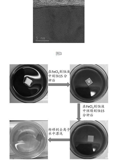 具體的,對于多層石墨烯/初始基底復合結構以初始基底為銅舉例說明,實物如圖2(a)、圖2(b)所示,其截面如圖所3示;蝕刻液選用FeCl3溶液。為便于本領域技術人員理解,以小尺寸多層石墨烯/初始基底復合結構的蝕刻過程進行展示,蝕刻過程如圖4所示,從圖4可看出,得到的多層石墨烯薄膜可自懸浮于液面上。