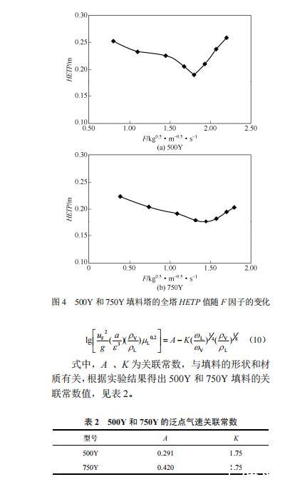 (2)實驗測定了氣相負荷從小到大直至液泛的流體力學性能和傳質性能,得到了液泛時的實驗數(shù)據(jù),給定了操作的極限。500Y規(guī)整填料塔的最大F因子Fmax=1.8kg0.5/(m0.5·s);750Y規(guī)整填料塔的最大F因子Fmax=1.5kg0.5/(m0.5·s)。對于正庚烷-甲基環(huán)己烷物系,500Y填料的泛點氣速為uF=0.98m/s,750Y填料的泛點氣速為uF=0.82m/s。并由實驗結果擬合出貝恩(Bain)-霍根(Hougen)關聯(lián)式中常數(shù)A、K的值。對于500Y填料A=0.291,K=1.75;對于750Y填料A=0.420,K=1.75。