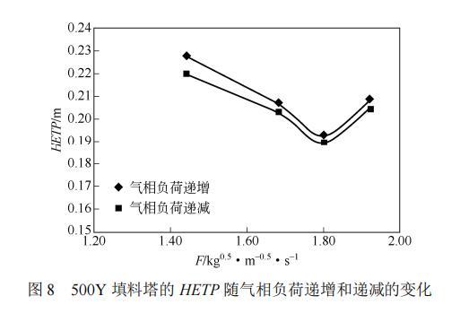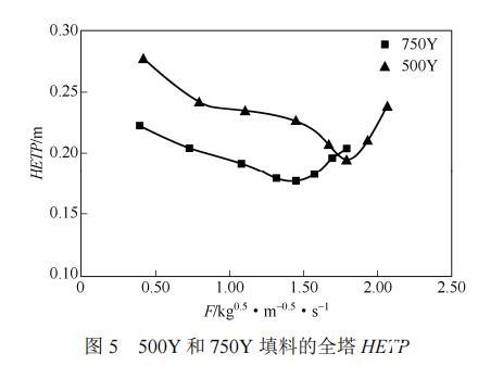 (1)在一定負荷范圍內,750Y填料的分離效率優(yōu)于500Y填料,但單位填料高度的壓降高于500Y填料,導致操作穩(wěn)定性比500Y填料差,處理量比500Y填料小。