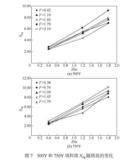 圖7為500Y和750Y填料塔中Nog隨塔高的變化。由圖7(a)可以看出,大多數(shù)情況下500Y填料塔中Nog隨塔高的變化為一條直線,即總體積傳質系數(shù)沿塔高不發(fā)生變化。這是因為在適宜的操作范圍內,塔內流動狀態(tài)比較穩(wěn)定,氣相負荷一定時,氣相傳質系數(shù)不變。正庚烷-甲基環(huán)己烷為純有機物系,表面張力中性體系,塔內形成的微弱的正表面張力梯度有利于液膜的穩(wěn)定,從而使有效傳質面積保持恒定。由此可以推測,對有機負體系而言,負的表面張力梯度會引起液膜沿流動方向不斷破碎,造成有效傳質面積的減小,因此Kya隨塔高下降不斷降低。這與耿皎等[18]在直徑為30mm的玻璃精餾塔中選用正體系庚烷-甲苯和負體系苯-庚烷的精餾實驗得到的結論一致。從圖7(a)可得當氣相負荷過小或過大時,500Y填料塔中Nog隨塔高的變化并不是一條直線,這說明總體積傳質系數(shù)Kya沿塔高發(fā)生變化。當氣相負荷很小時,總體積傳質系數(shù)Kya沿氣相流動方向減小;當氣相負荷很大時,總體積傳質系數(shù)Kya沿液相流動方向減小。當流體流量過高或過低時,塔內流動狀態(tài)極不穩(wěn)定,過低的氣相負荷,使氣相傳質系數(shù)沿氣相流動方向減小、氣液相接觸減弱,即表現(xiàn)為總體積傳質系數(shù)Kya隨塔高增加而減小;而過大的氣相負荷,引起液泛,液體積聚在塔上部很難流下,使沿液相流動方向液相傳質系數(shù)減小、氣液相接觸減弱,即表現(xiàn)為總體積傳質系數(shù)Kya隨塔高降低而減小。對比圖7(a)和7(b)可得,750Y填料塔中總體積傳質系數(shù)Kya隨塔高的變化規(guī)律與500Y填料塔一致。